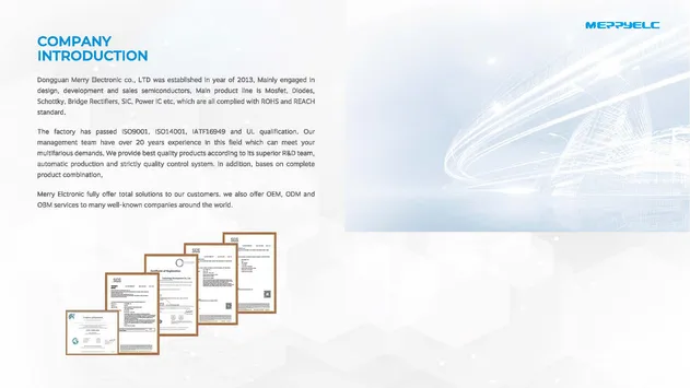 Established in 2013, we are a professional supplier of semiconductor discrete device sales and technical services. Our core product lines include Rectification, Ultra-fast recovery, Schottky, Zener diodes, Bridge rectifiers, and high-performance SIC MOSFETs. Our solutions cover SMPS, motor control, consumer electronics, and automotive applications.
